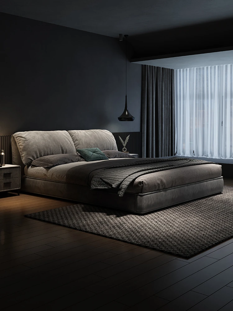 陶益のイタリアンミニマリズム、浮遊感のある真皮ヘッドボード!1.8メートル大ダブルベッド、和の侘寂スタイルで上質な眠りを実現。デザインと機能を兼ね備えた、贅沢な主寝室のためのベッド。