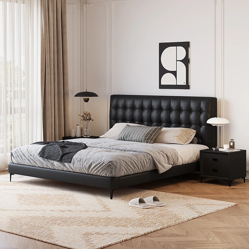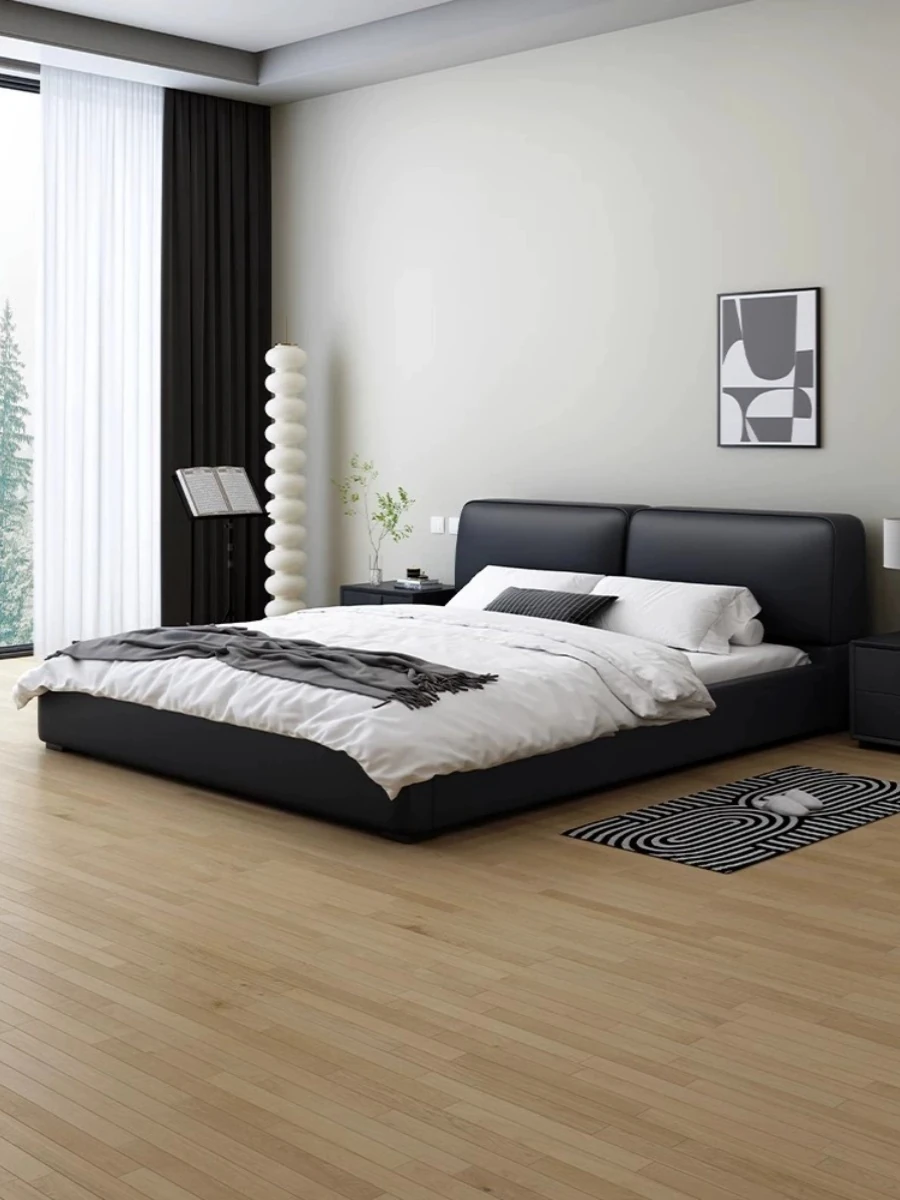 Nordic Palace Creamy Italian Minimalist Black Leather Tofu Block Bed – Modern Luxury Soft-Pack Bed for Master Bedroom